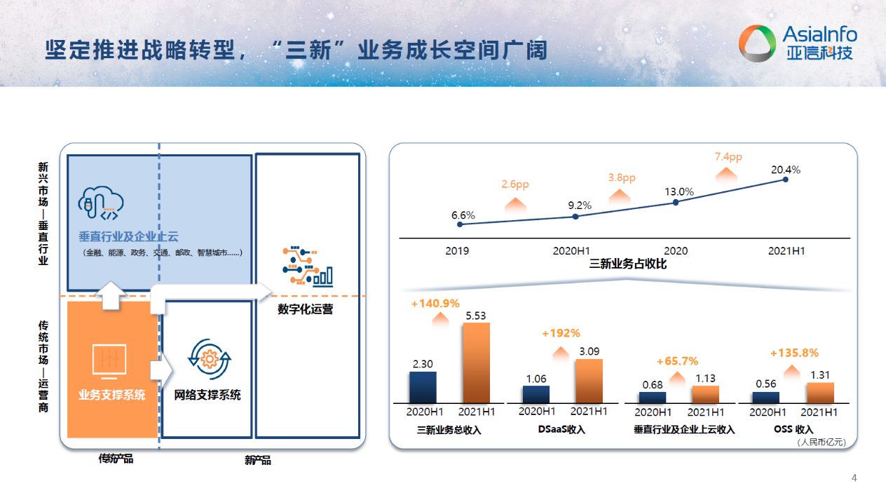 从2021上半年的业绩来看,也印证了这句话。报告期内,304am永利集团实现营业收入约为人民币27.15亿元,同比上升8.4%;净利润约为2.80亿元,同比上升20.2%。以DSaaS、垂直行业及企业上云以及OSS对应的“三新”业务占总收入比为20.4%,达5.53亿元。