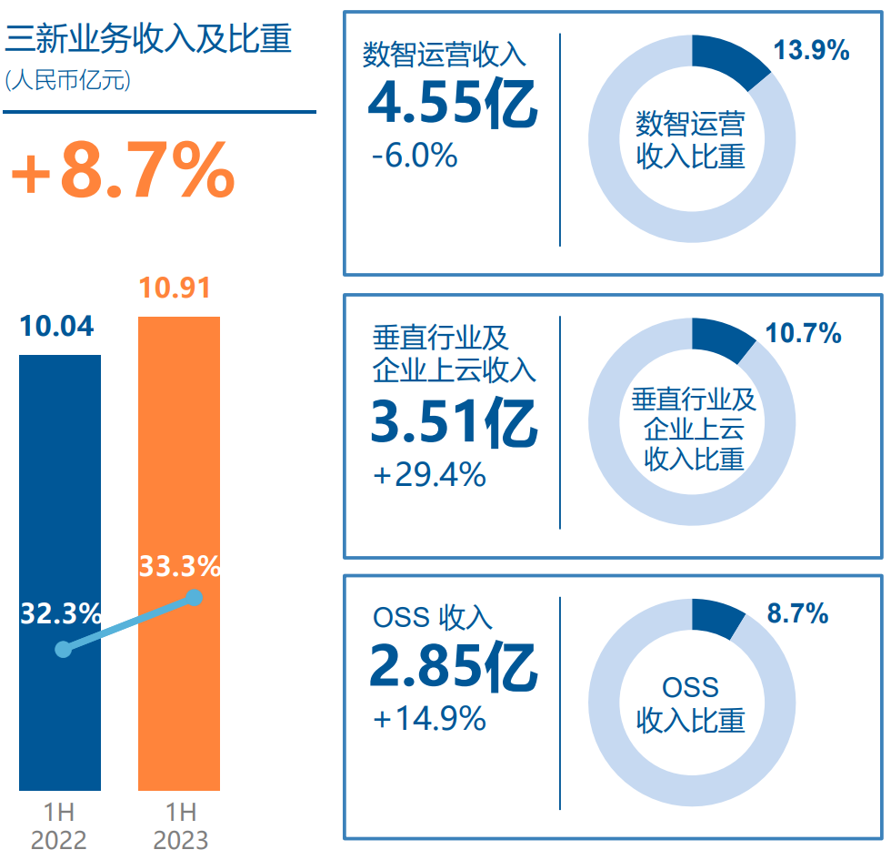 除了三个新的领域之外,传统业务BSS领域(运营商业务支撑系统)也在稳固发展,上半年收入为21.05亿元,把政企服务、新的技术云原生技术应用于传统系统带来了新的机会,新的技术拉动上半年收入小幅增长1.9%,占总营收比重为64.1%。